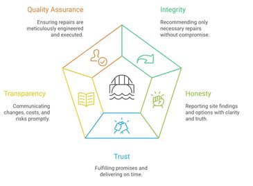 We are committed to delivering rehabilitated concrete structures that not only meet technical specifications but exceed our clients’ expectations for durability and performance. Our decisions are guided by the values of integrity, honesty, trust, and transparency—ensuring clear communication, fair recommendations, and work carried out to the highest standards. This ethical foundation builds long‑term relationships and gives clients confidence that every repair is engineered and executed for lasting serviceability
